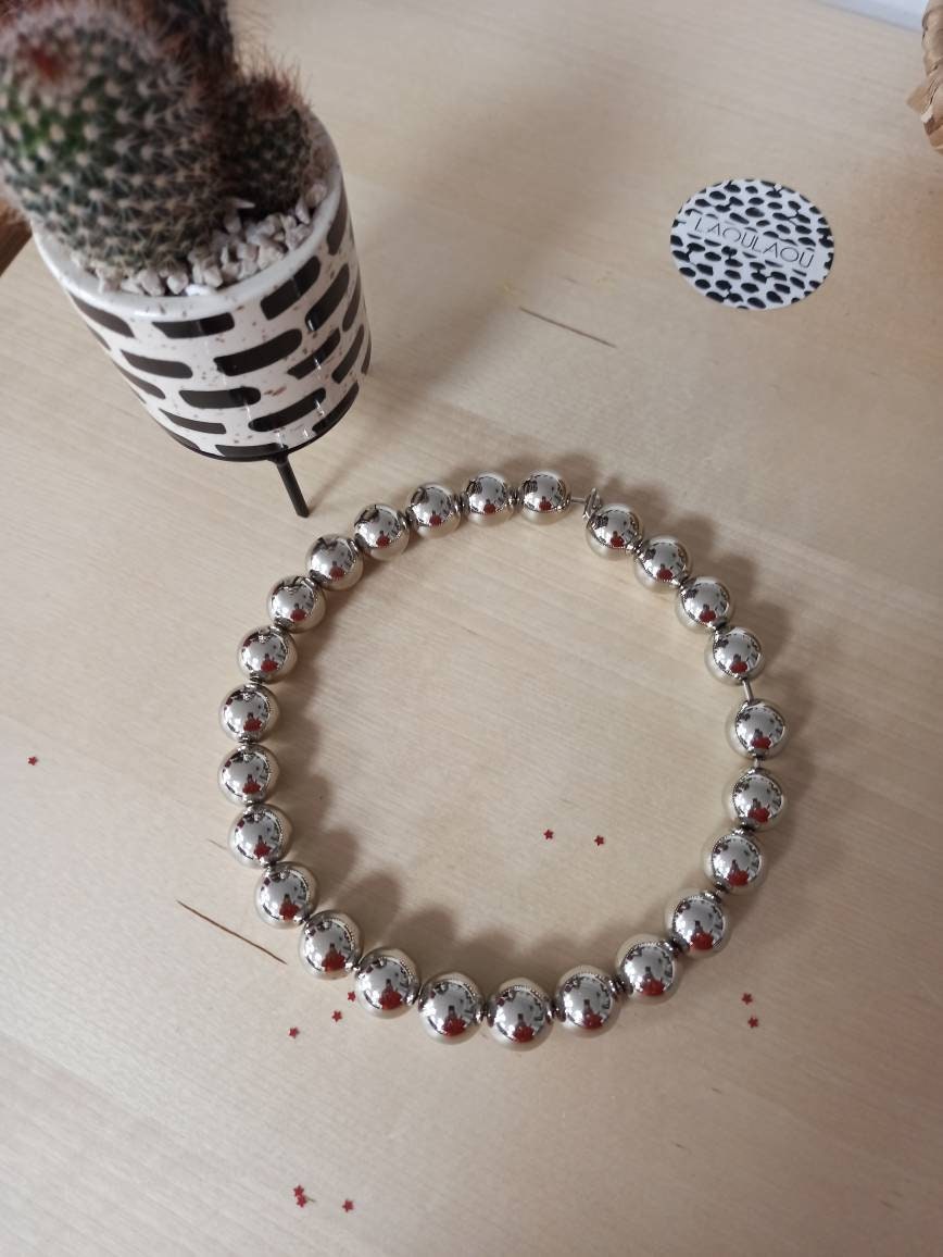 Made of steel choker and silver or gold color balls that represent an endless orbit.