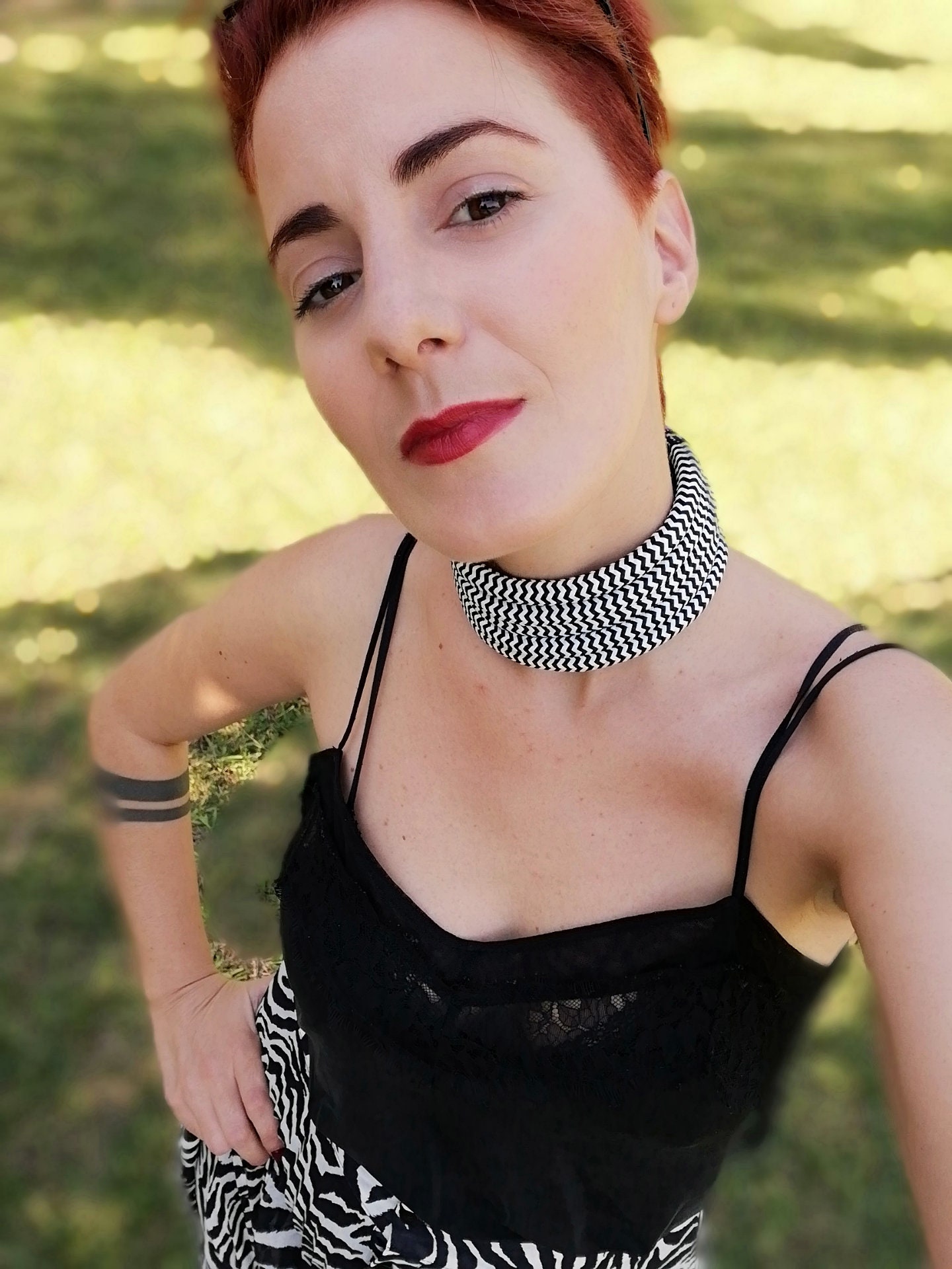 NYX is a bold, handmade multi-strand tribal choker with matching earrings, featuring a striking black & white pattern. It’s a true statement piece—perfect to add an ethnic edge to minimalist outfits and to complete a confident boho look.