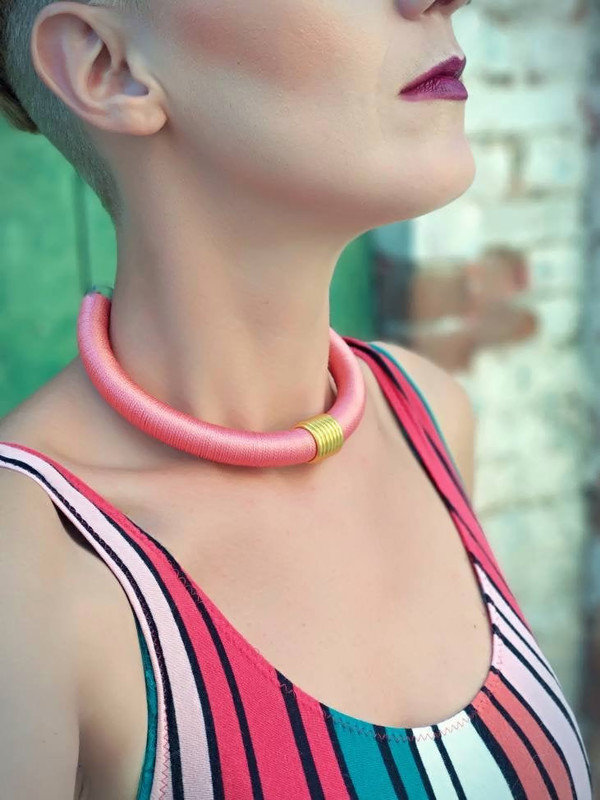 Light Pink African Stacked Chokers, Salmon Pink with Gold Spiral Bib Necklace, Tribal Jewelry, Personilized Unique Jewelry Handmade