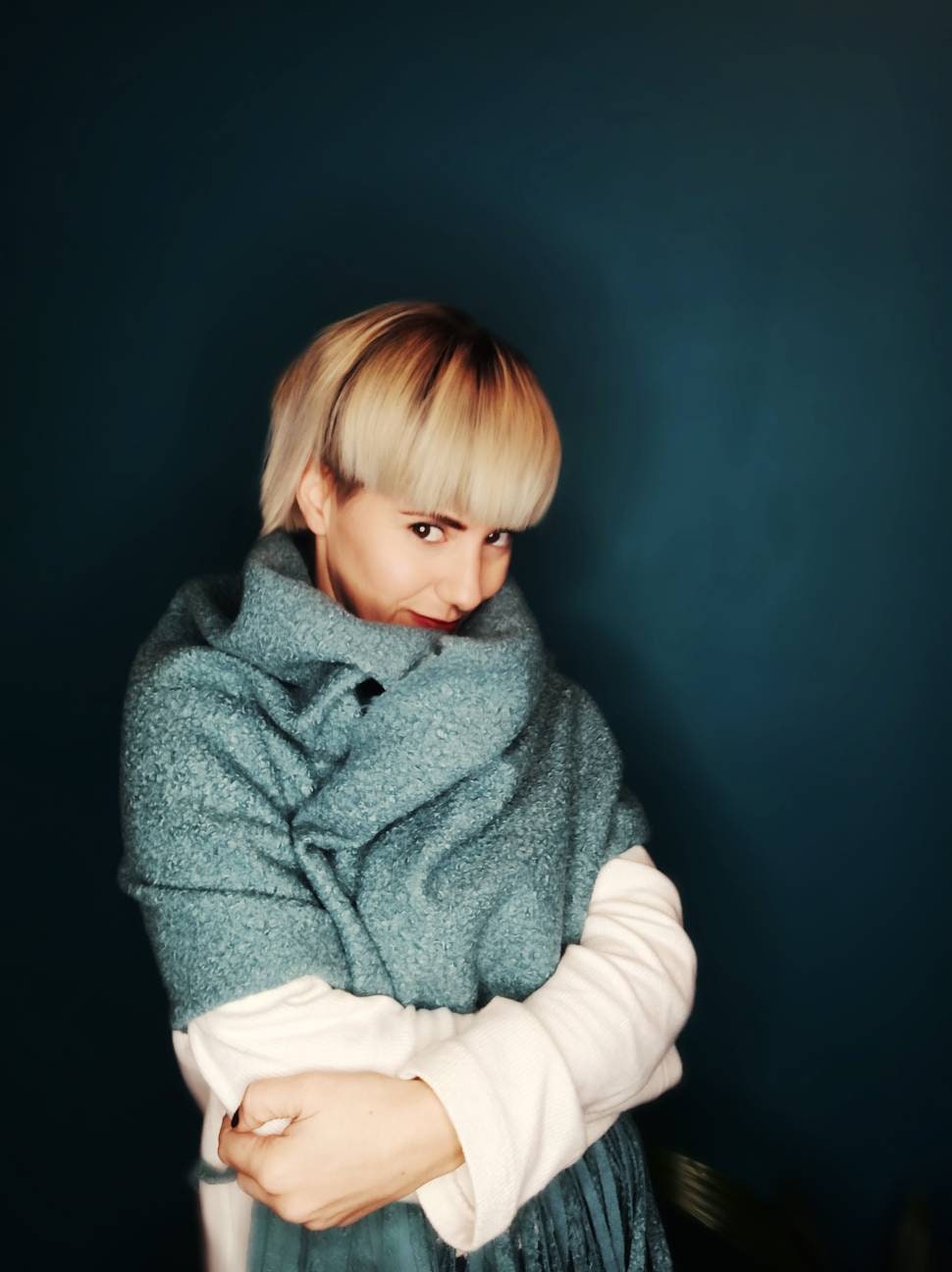 Large oversized shawl wrap for women, wool knitted shawl, wrap in black, teal and black&white colors. This scarf is very soft and comfortable to wear, lightweight but very warm.